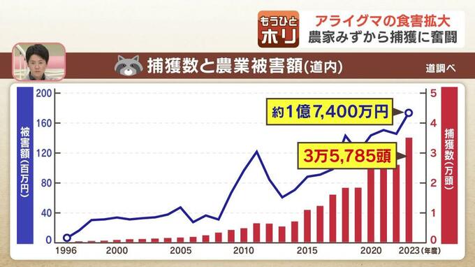 「残念ながら(数が)減るような捕り方がされていないのが現状。アライグマは平均4頭子どもを産む。アライグマ100頭いたとして、なにも捕獲しないで放っておくと、12年後には1万頭を超える」