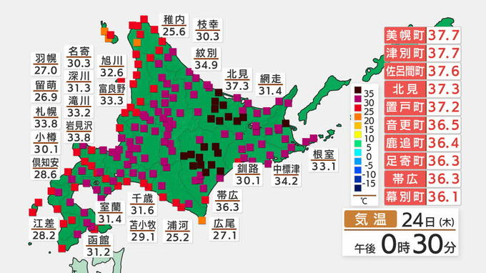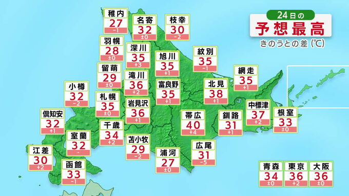 24日も、北海道内は各地で気温が上がり、帯広の最高気温は40℃と予想されるなど危険な暑さになるおそれがあります。熱中症に厳重な警戒が必要です。