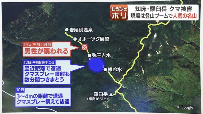 今回の事故が起きる前の、10日、12日にも至近距離でクマと遭遇していて、12日は、登山者がクマよけスプレーを噴射したものの、その後数分間、クマに付きまとわれたということがありました。