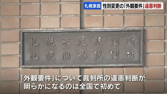 性別変更の「外観要件」は違憲 近年の性同一性障害の治療との合理的な関連性を欠くと判断 全国初 札幌家裁 2025年9月24日(水) 13:24 国内 札幌市に住むトランスジェンダーの男性が、戸籍上の性別の変更を求めた審判で、札幌家庭裁判所が法律で定めた「外観要件」を違憲と判断したことがわかりました。性同一性障害特例法では性別の変更について5つの要…