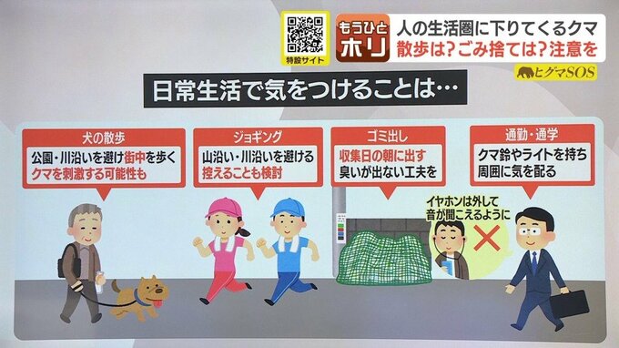 ・子どもの登下校や通勤通学は?⇒熊鈴を持つことも有効。夜間は簡易ライトを持つことや周囲に気を配る。特にイヤホンは外して、音が聞こえるようにする。