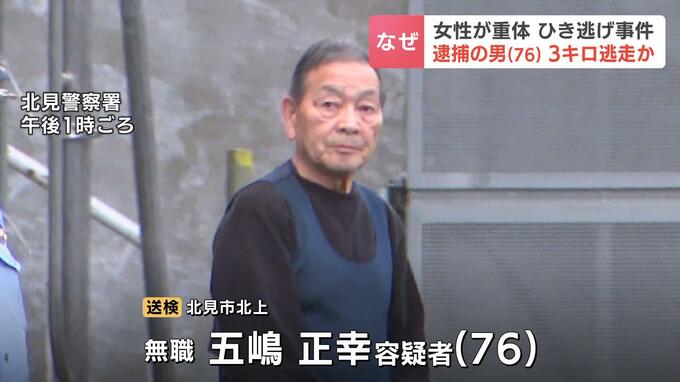 女性重体ひき逃げ事件で逮捕された76歳の男 現場から約3キロ逃走か 取り調べに「間違いありません」北海道北見市・国道39号線 2025年10月2日(木) 18:37 国内 9月30日、北海道北見市で女性が車にはねられて重体となったひき逃げ事件で、逮捕された男が現場から約3キロ逃走していたことがわかりました。 北見市の無職・五嶋正幸容疑者76歳は、9月30日午後1時半ごろ、…