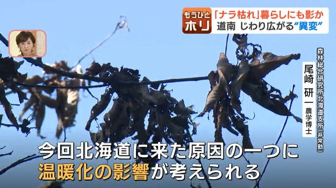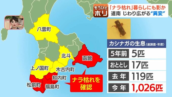 実際にナラが枯れたのは函館市のほか、道が松前、福島、知内の3町で確認しました。専門家は、カシナガの北上が、今後も続くとみています。