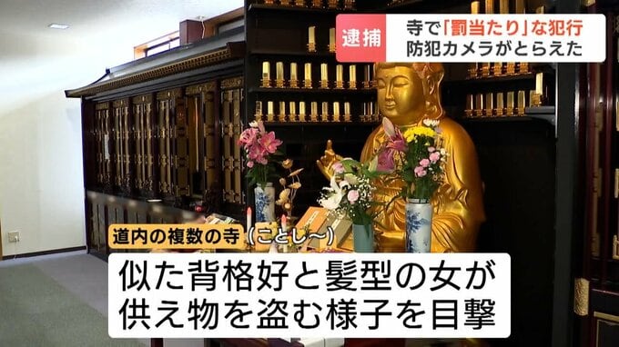 北海道内の複数の寺では、今年に入ってから、似た背格好と髪型の女が供え物を盗む様子が目撃され、森容疑者が別の事件の関与をほのめかしていることから、警察は余罪があるとみて調べています。