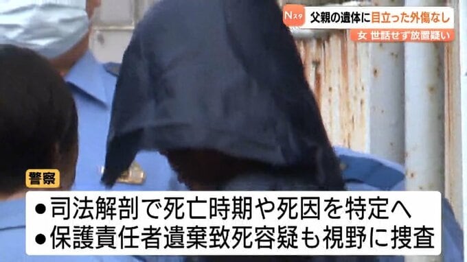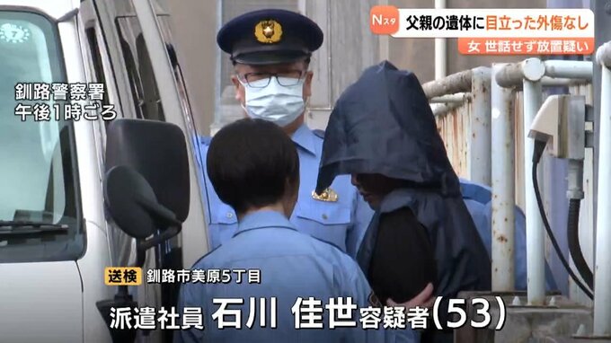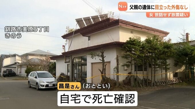 北海道釧路市の住宅で、80代の父親の世話をせず放置した疑いで53歳の女が逮捕された事件で、父親の遺体に目立った外傷がなかったことがわかりました。
