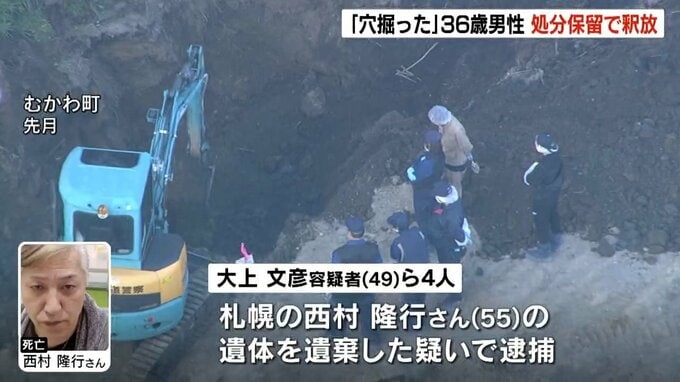 大上容疑者以外の3人は、西村さんと面識がないとみられ、処分保留で釈放された苫小牧市の男性(36)はこれまでの捜査本部の取り調べに「頼まれて穴を堀った」「西村さんはまったく知らない人」などと供述していたということです。
