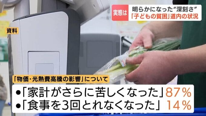 「家計がさらに苦しくなった」と答えた人は87%、「食事を3回とれなくなった」と回答した人は14%でした。