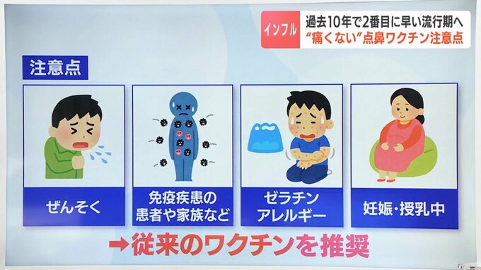 点鼻タイプは弱毒化した、生のウイルスを体内に取り込むので飛沫などで他の人に移してしまう可能性があり、品質保持の「安定剤」にはゼラチンが含まれています。