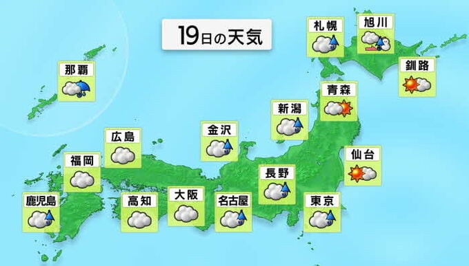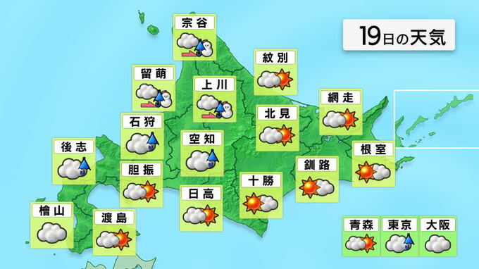 北海道付近は、19日日曜日の夜から西高東低の気圧配置となり、上空1500mには11月下旬並みの18℃前後の平地でも雪の降るような寒気が流れ込みます。