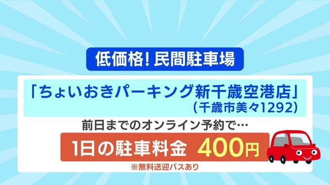 例えば、低価格が魅力の「ちょいおきパーキング新千歳空港店」では、前日までのオンライン予約で、1日の駐車料金がなんと400円。
