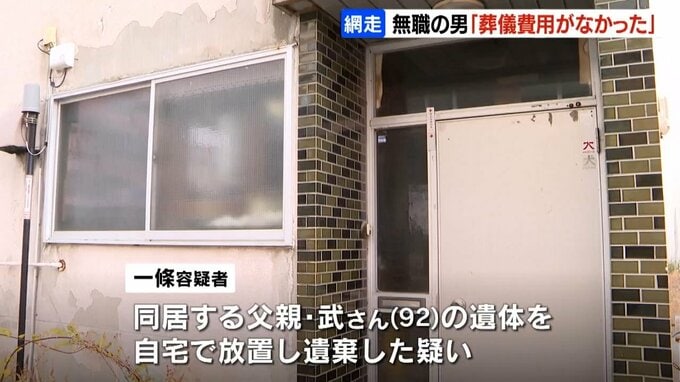 北海道網走市で、同居する92歳の父親の遺体を自宅に放置したとして、61歳の無職の男が逮捕されました。