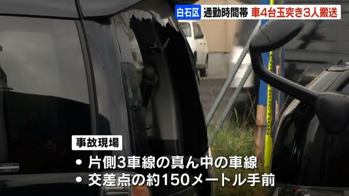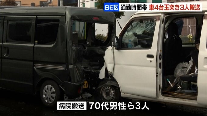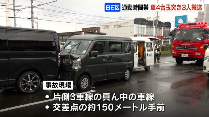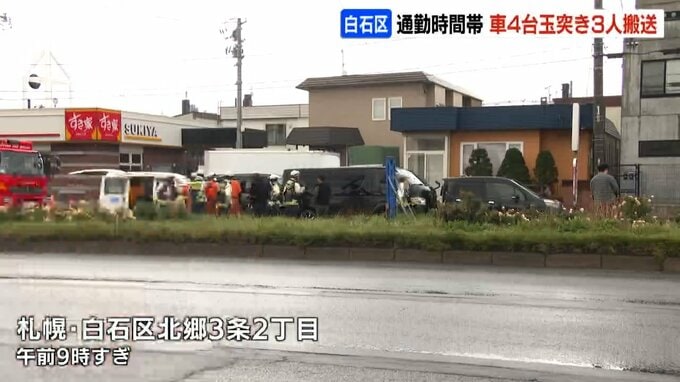 24日朝、札幌市白石区の幹線道路で軽乗用車など4台が関係する玉突き事故があり、あわせて男性3人が病院へ運ばれました。