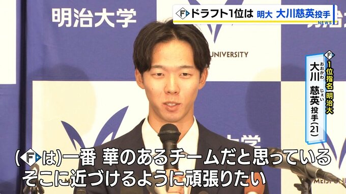 23日、プロ野球ドラフト会議が行われ、北海道日本ハムファイターズは明治大学の大川慈英投手の交渉権を獲得しました。