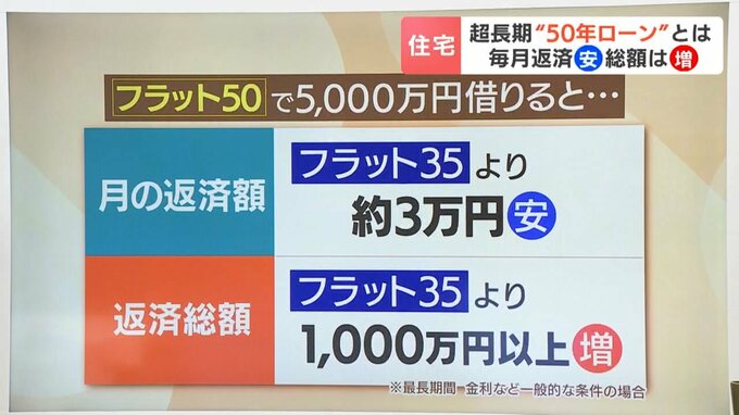 ファイナンシャルプランナーの加藤桂子さんによりますと、金利など一般的な条件で5000万円を借りた場合、フラット50は月々の支払いがフラット35よりも3万円ほど安くなります。