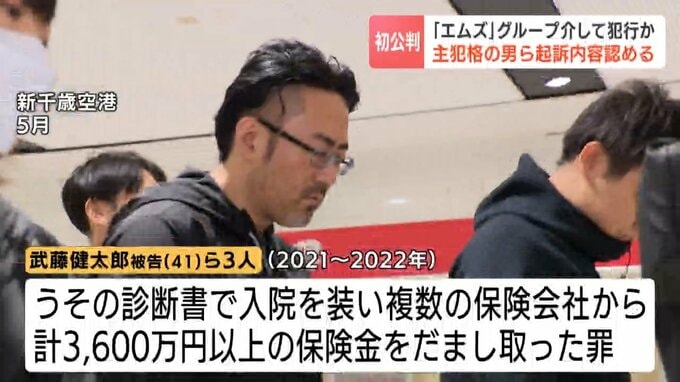 起訴状などによりますと、札幌で飲食店などを経営するエムズグループの会長、武藤健太郎被告ら3人は、2021年から2022年にかけて、うその診断書で入院を装い、複数の保険会社からあわせて3600万円以上の保険金をだまし取った罪に問われています。