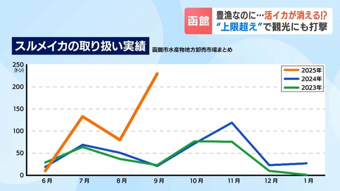 6月の漁獲量はわずか10トンにとどまりましたが、不漁から一転、9月には7年ぶりに200トンを超えました。