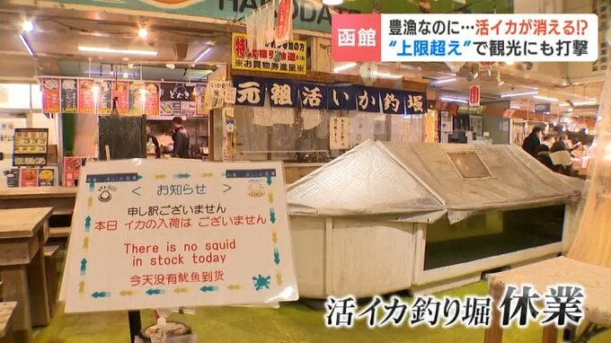 「函館朝市は平日のきょうも観光客などで賑わっています。しかし名物の活イカの釣り堀は、イカの仕入れがないため、このようにカバーがかけられ休業しています」