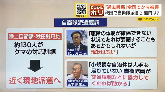 堀内キャスター)自衛隊の派遣要請について、札幌市の秋元市長は、30日の定例会見で「駆除の体制が確保できない状況であれば、要請することもあるかもしれないが現状はない」と述べました。