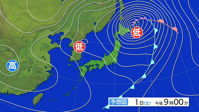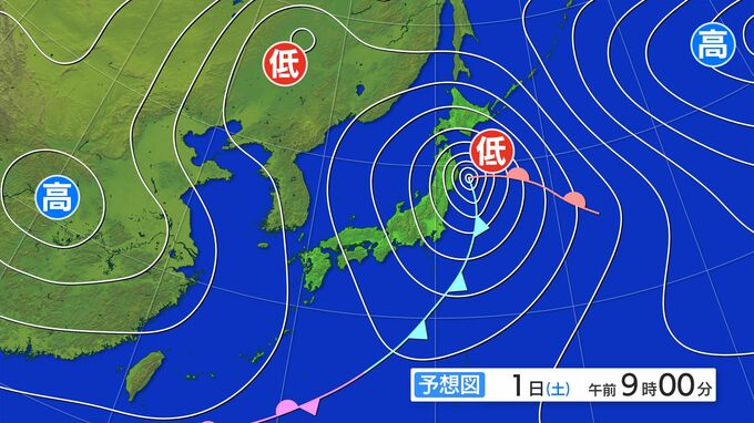 低気圧は東北方面から千島近海に向かって急速に発達しながら北海道のすぐ南を通過し、中心気圧は1日夜には968hPaまで下がる見込みです。