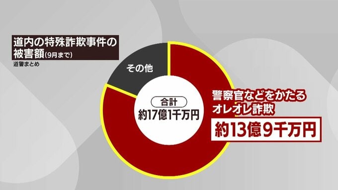 北海道警察によりますと、9月末までに北海道内で発生した警察官をかたる特殊詐欺の被害額は、約13億9000万円。