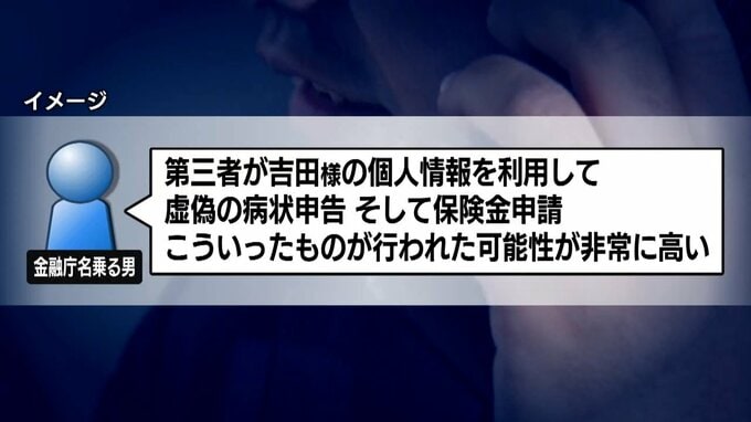 「第三者が吉田様の個人情報を利用して虚偽の病状申告そして保険金申請、こういったものが行われた可能性が非常に高い」