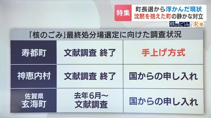 『核のごみ』最終処分場の選定について、寿都町は自ら応募した、いわゆる「手上げ方式」をとり、神恵内村と佐賀県玄海町の2箇所は、国からの申し入れを受けて自治体が判断したケースです。