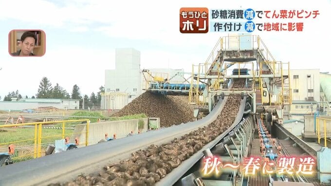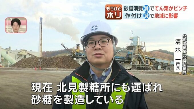 国内産の砂糖の8割は、このてん菜を原料に作られていて、北海道を代表する作物ですが、健康志向の高まりや人工甘味料の広がりを受け、砂糖の需要が落ち込んでいます。