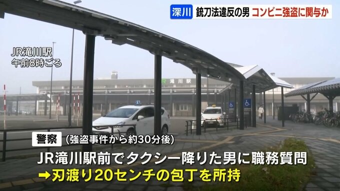 この事件の約30分後、20キロほど離れたJR滝川駅前で警戒していた警察官がタクシーを降りた男に職務質問したところ、バッグの中に刃渡り20センチほどの包丁を持っていたため、銃刀法違反の疑いで現行犯逮捕しました。