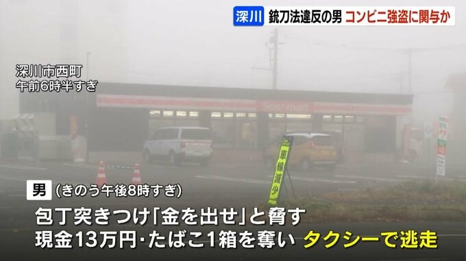 5日夜、北海道深川市でコンビニ強盗があり、警察は滝川市で包丁を持っていたとして逮捕した男が関与しているとみて捜査しています。