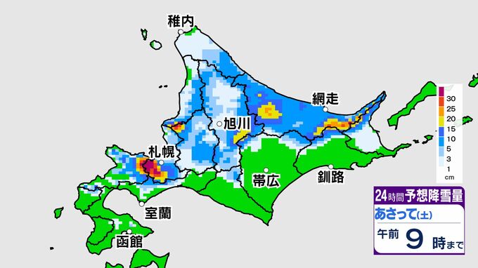 8日朝までの24時間に降る雪の量は、知床半島や中山峠周辺など多いところで20センチ前後の予想です。