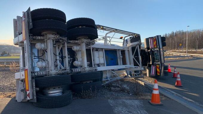 11日午後0時半ごろ、浦幌町栄穂(えいほ)にある道東自動車道の上浦幌(かみうらほろ)パーキングエリアで、生乳を運んでいたミルクローリーが横転しました。