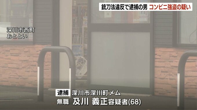 銃刀法違反容疑の68歳の男 約1時間前にコンビニから現金13万円とたばこを奪った強盗容疑でも逮捕「私がしたことに間違いない」 2025年11月8日(土) 09:10 国内 5日夜、北海道滝川市のJR滝川駅前で銃刀法違反の疑いで逮捕された68歳の男が、深川市のコンビニエンスストアから現金などを奪った強盗の疑いで逮捕されました。逮捕された深川市の及川義正容疑者(68)は5日午後8…