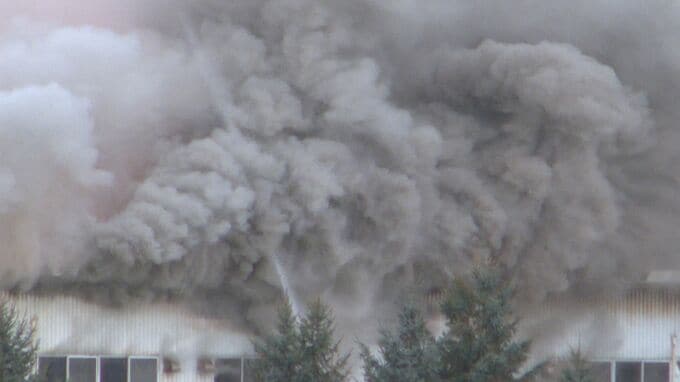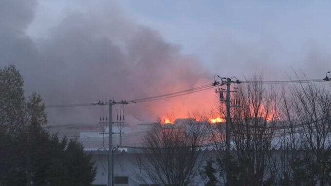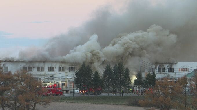 9日早朝、北海道網走市の鶏肉の加工場で火事があり、5時間経ったいまも消火活動が続いています。
