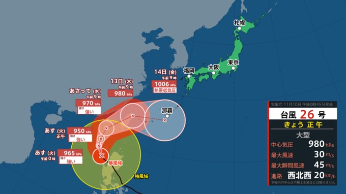 10日午前9時現在、大型で強い台風26号が南シナ海にあり西北西に進んでいます。