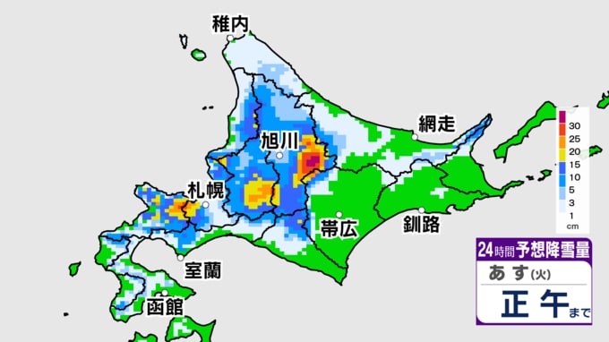 あす正午までの24時間に降る雪の量は、いずれも多いところ、大雪山系の山沿いで20~30センチ、内陸で10~20センチでしょう。札幌市街地でもうっすら積もるおそれがあるため、路面状況の変化に注意が必要です。
