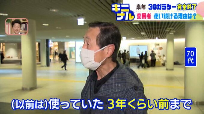 70代「(ガラケーを)見てない、最近は。(以前は)使っていた。3年くらい前まで。まだ(本体を)持っていて目覚ましだけに使っている。なんか捨てられなくて」