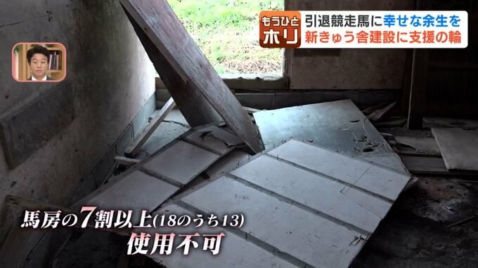 しかし、老朽化がさらに進み、馬が生活する部屋=馬房の7割以上が雨漏りや天井や壁の崩落などによって使えない状態になっています。