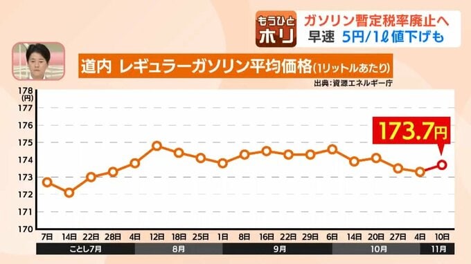 資源エネルギー庁が12日発表した、北海道内のレギュラーガソリンの平均小売価格は1リットルあたり173.7円。170円を超える高止まりが続いています。