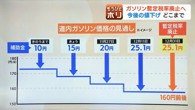 ガソリン25.1円の暫定税率に対し、現在出ている10円の補助金にプラスして、13日から5円、そして2週間ごとに5円ずつプラスして、12月には暫定税率と同じ25.1円の補助金ということになります。