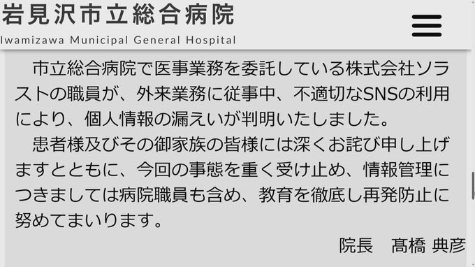 髙橋典彦院長は、「医事業務を受託している株式会社ソラストの職員が外来業務に従事中、不適切なSNSの利用で個人情報の漏えいが発生したもので、患者様及びその御家族の皆様には深くお詫び申し上げますとともに、今回の事態を重く受け止め、情報管理につきましては病院職員も含め、教育を徹底し再発防止に努めてまいります」とコメントしています。