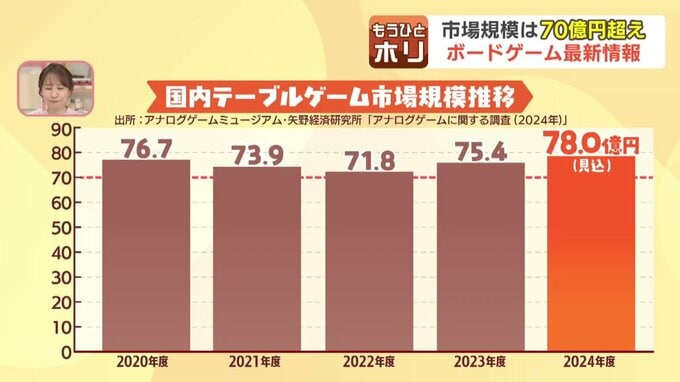 ボードゲームを中心としたテーブルゲームの国内の市場規模は年間70億円を超え、コロナ禍での縮小から回復し、拡大傾向にあります。