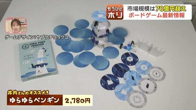 「こちらの『ゆらゆらペンギン』というゲームをお勧めいたします。こちらジェンガのようなバランスゲームになっておりまして、紙でできた山を上に積み上げていき、崩さないようにするというゲームです。紙製なので持ち運びやすく、崩れた時の音も大きくなく、子どもから大人まで一緒に遊べるいいゲームになっております」