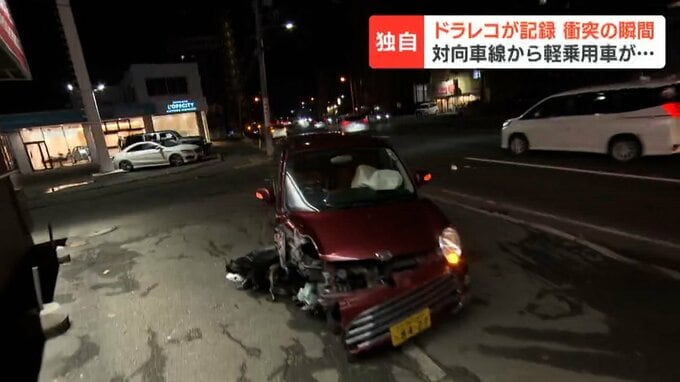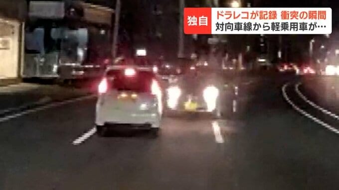 対向車線を飛び出した軽乗用車が、そのまま直進し、目の前を走っていた白い軽乗用車に衝突。