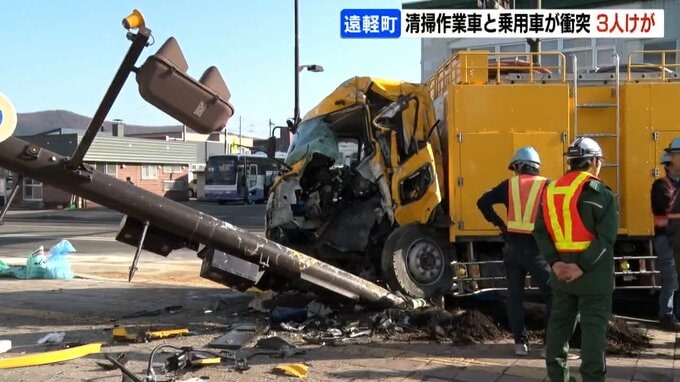 信号機と街路灯が折れる被害も 国道交差点で清掃作業車と乗用車が出会い頭に衝突 3人けが 北海道遠軽町 2025年11月25日(火) 12:19 国内 25日朝、北海道遠軽町の中心部の交差点で、清掃作業車と乗用車が出会い頭に衝突し3人が病院に運ばれました。事故の衝撃で信号機と街路灯が折れています。事故があったのは、遠軽町大通北1丁目の国道242号の交差点…
