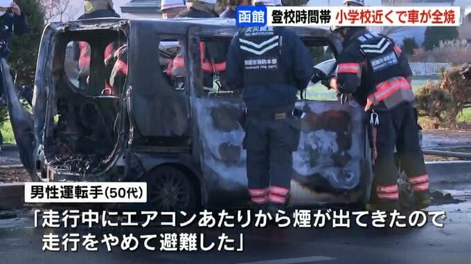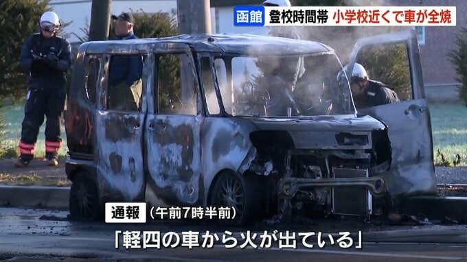 27日朝、北海道函館市の市道で軽乗用車から火が出て全焼しました。