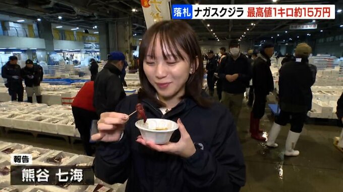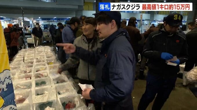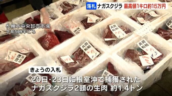 北海道東部沖で捕れたナガスクジラの生肉が札幌の市場で取り引きされ、最高値で1キロ15万円余りで落札されました。
