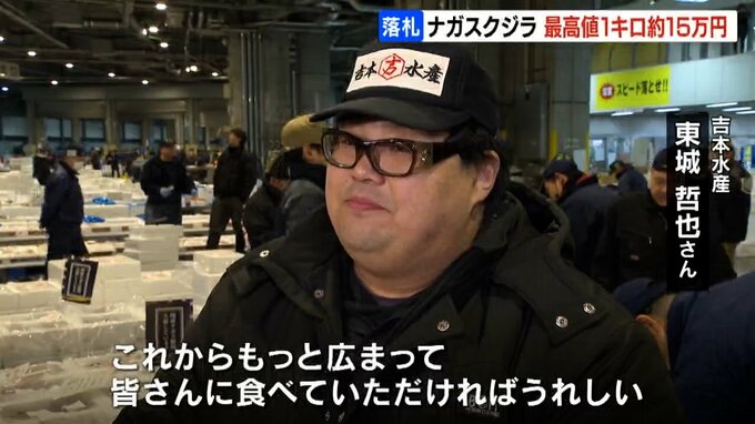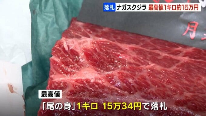 去年、商業捕鯨としておよそ半世紀ぶりに道内の港に水揚げされたナガスクジラですが、28日朝の取引では尾びれの付け根付近の高級部位である「尾の身」が最高値で1キロ15万34円で落札されました。