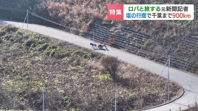近づいてくる車が、クサツネは気になるようです。長い峠の道を蛇行しないように、高田さんが「ほいほい」と大きな声を掛け、リヤカーを後ろから押して進みます。