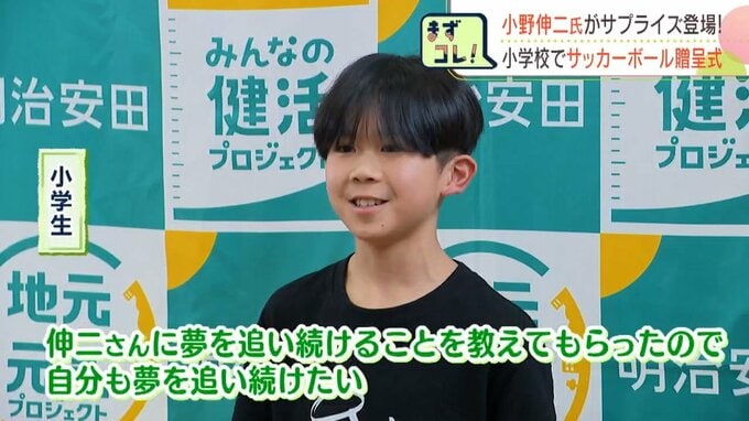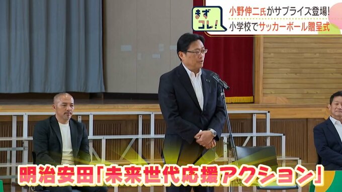贈呈式は、Jリーグのタイトルパートナーである「明治安田生命」の「未来世代応援アクション」の一環で、プレゼンターの小野さんはさっそく、子どもたちにリフティングなど華麗なボールさばきを披露。