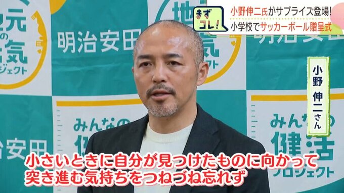 小野さんは、28日、札幌市白石区の本郷小学校でサッカーボールの贈呈式に参加しました。